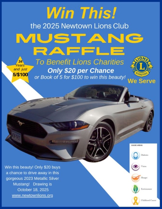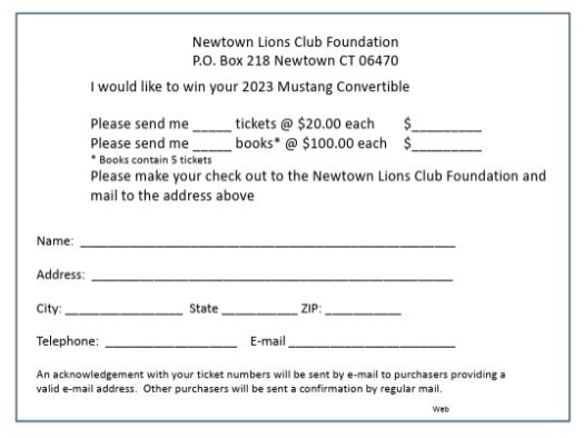 The Newtown Lions Club was chartered in 1949. The club carries out the Lions motto “We Serve” by supporting and participating in international and state programs and by contributing to the local community. Fund raising activities include our annual Classic Mustang Raffle, The Great Pootatuck Duck Race, and various community projects. All funds raised thru these efforts go towards our charitable efforts. The club and its members do not benefit from any funds generated from these activities.