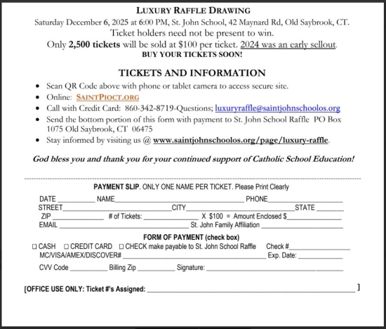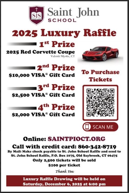 focuses on providing an opportunity for students, parents, and staff to foster a deeper relationship with Jesus Christ. Infused with our faith, we strive to provide challenging academic programs in which dedicated, professional educators and familiars work together in a safe environment to inspire individual growth, self-discipline, confidence and Christian service. We are a non-profit organization that relies on the graciousness of others’ support. All profits from this raffle support annual operating costs to the school towards facility maintenance and improvements and in keeping tuition costs low for families.
