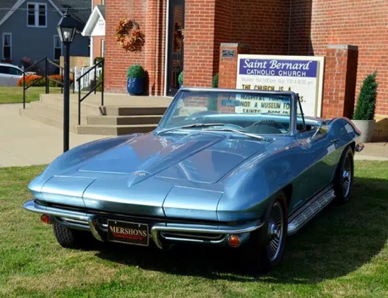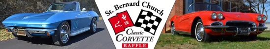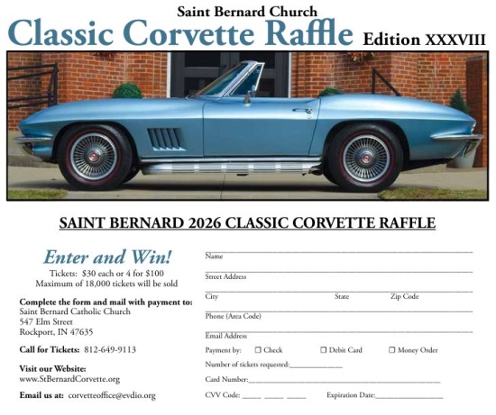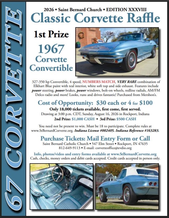 The 378th Annual Saint Bernard Classic Car Raffle features a beautiful, Elkhart Blue, numbers matching 1967 Corvette Convertible! Our parishioners and students thank you for your continued support and for purchasing opportunities. Proceeds from this all-volunteer effort benefit Saint Bernard Catholic Church and School in the small town of Rockport, Indiana. A maximum of 18,000 tickets can be sold. The drawing is August 17, 2025 at 3:00 p.m. CDT. Indiana Raffle License #002405.