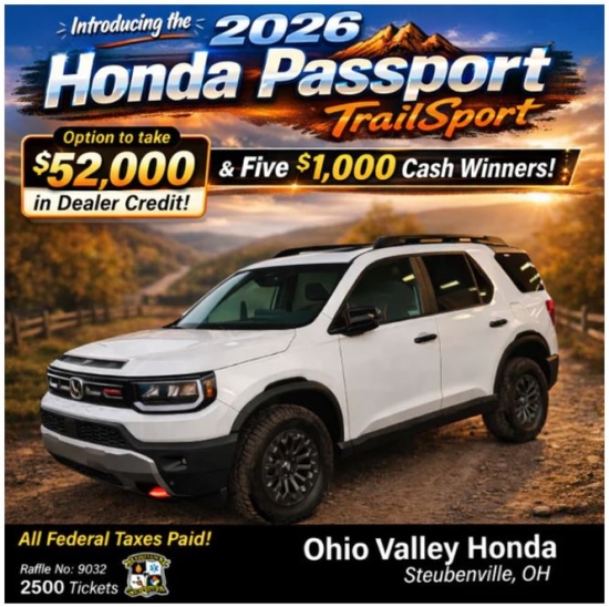 Tickets for the 2026 Honda Passport Trailsport or $52,000 Dealer Credit (Federal Taxes PAID) are just 1 for $37 and only 2,500 tickets offered and this drawing is March 15th, 2026 or when all tickets sold.
