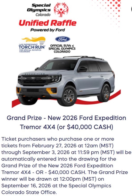 Special Olympics Colorado is a nonprofit organization that empowers individuals with intellectual disabilities to become physically fit, productive and respected members of society through sports training and competition, and we couldn’t do it without our generous supporters. When you purchase a ticket for the raffle, you are helping Special Olympics Colorado continue its mission. Thank you for your important support