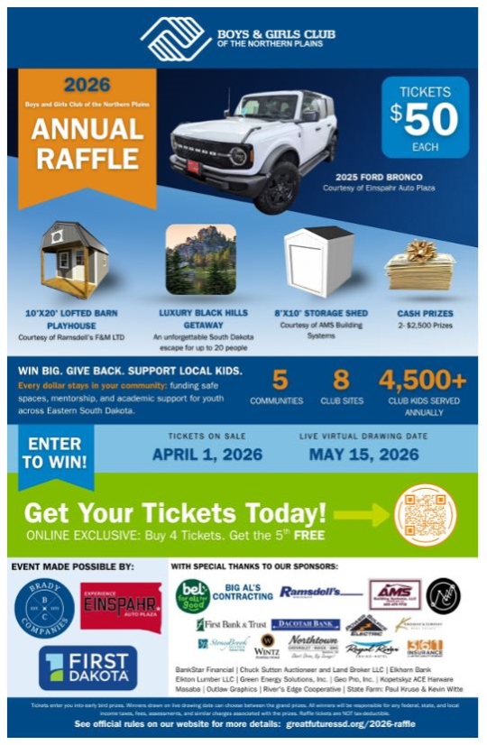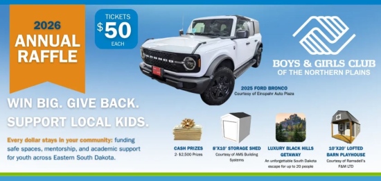 This raffle is hosted annually but the date may change year after year. Boys & Girls Club of the Northern Plains serves more than 4,500 young people each year across Brookings, Elkton, Flandreau, Vermillion, and Yankton. From early childhood through high school graduation, we are there with programming, mentors, meals, and a place kids are proud to call their own. Every dollar raised through this raffle goes straight back into the Clubs that make it all possible.