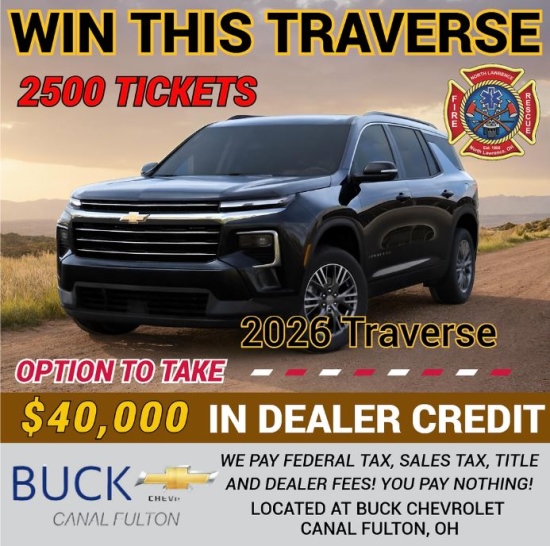 The North Lawrence Volunteer Fire Department Raffle Grand Prize: - a 2026 Chevrolet Traverse or $40,000 Dealer Credit Option - All title work will done at Buck Chevrolet. The vehicle sales tax, title work, temporary tag and federal income tax will be included as part of winning the car - You can view this vehicle in person at Buck Chevrolet, 321 S CANAL ST, CANAL FULTON, OH 44614 - As of 4/11/2026 there are only 981 tickets remaning of 2,500 - (posted 4/11/2026)