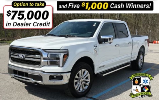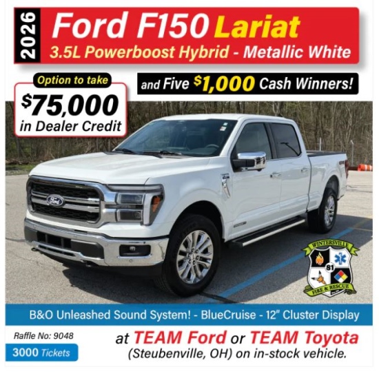 The Wintersville Fire Department May Drawing Grand Prize: - a 2026 Metallic White Ford F150 Lariat Pickup or $75,000 Dealer Credit (Federal Tax & Sales Tax PAID) - B&O Unleashed Sound System. BlueCruise, 12' Display - First chip pulled wins the truck, next five pulled win $1000.00 cash each - Truck winner can also choose to take $75,000 in dealer credit to purchase any other in stock vehicle at TEAM Automotive or TEAM Toyota in Steubenville, Ohio - All title work done at TEAM Automotive - The vehicle Federal taxes, state sales tax, title work, and tag will be paid for by the fire department - as of 4/19/2026 there are only 2,091 of the original 3,000 tickets remaining - (posted 4/19/2026)