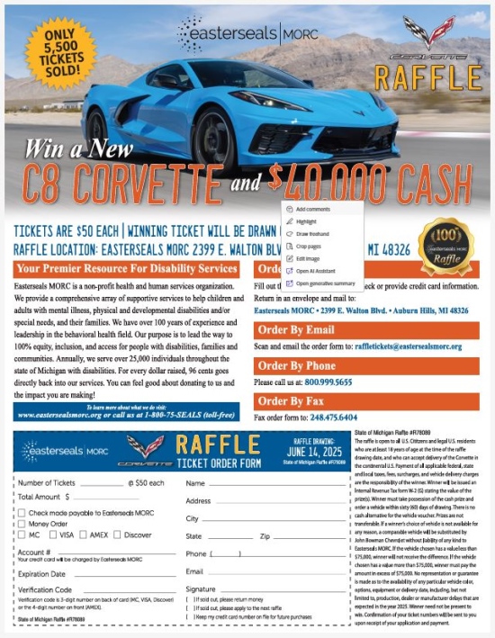 Easterseals Michigan Morc 6/14/2025 raffle – New C8 Corvette and $40,000 Cash –
