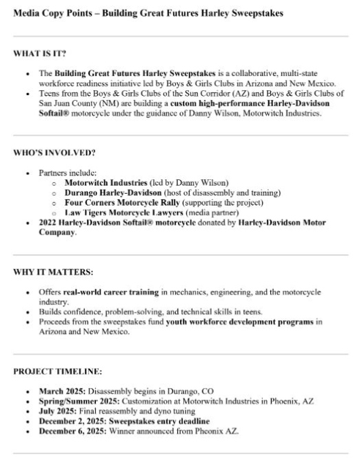 The Boys & Girls Clubs of San Juan County (NM) and the Boys & Girls Clubs of the Sun Corridor (AZ) are proud to announce a groundbreaking partnership with Harley-Davidson Motor Company, Motorwitch Industries, Durango Harley-Davidson, and the Four Corners Motorcycle Rally.